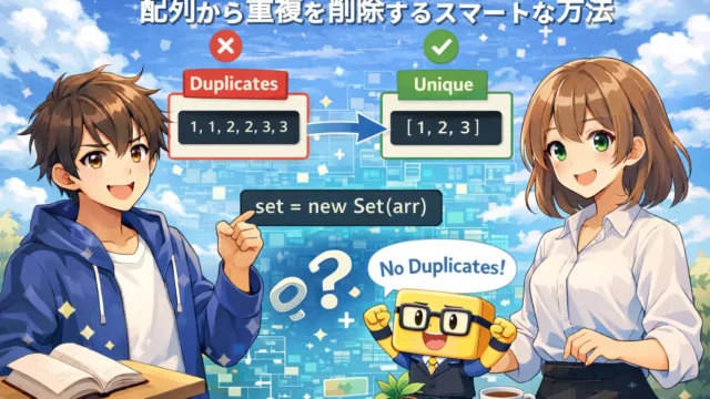 JavaScript実践テクニック 配列から重複を削除するスマートな方法 JavaScriptで配列を扱っていると、重複した値を削除したい場面はよくあります。例えば次のような配列です。const numbers = [1, 2, 3, 3, 4, 4, 5]const numbers = [1, 2, 3, 3,... 2026.01.03 JavaScript実践テクニック